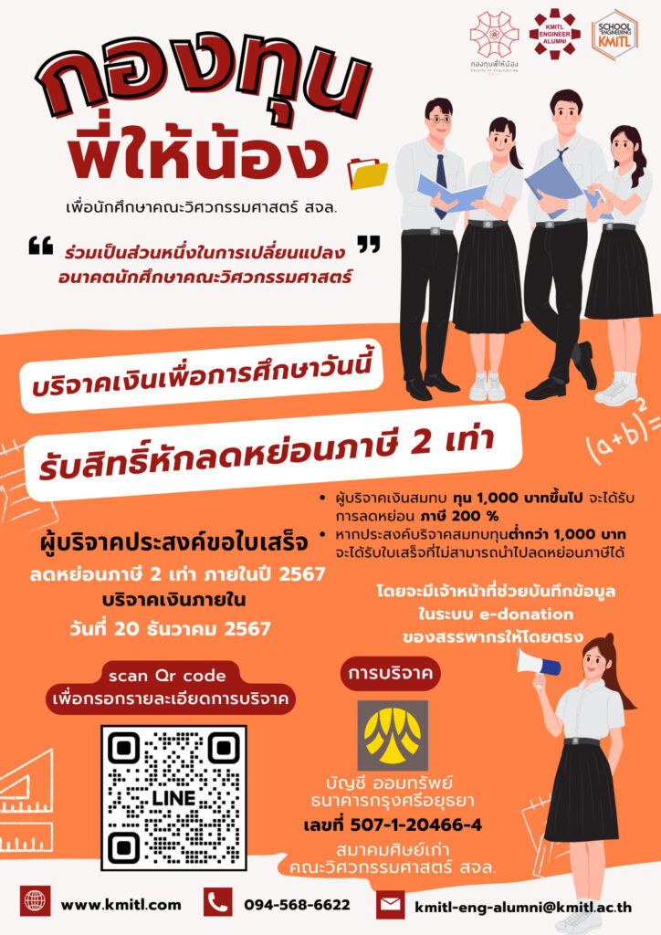 ร่วมเป็นส่วนหนึ่งในการสนับสนุนกิจกรรมและทุนการศึกษาให้กับน้องๆ นักศึกษาคณะวิศวกรรมศาสตร์ สจล ” กองทุนพี่ให้น้อง เพื่อนักศึกษาคณะวิศวกรรมศาสตร์ สจล.”