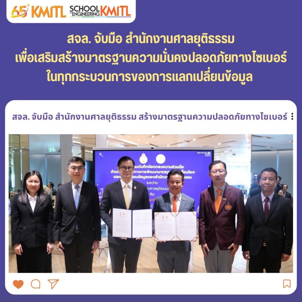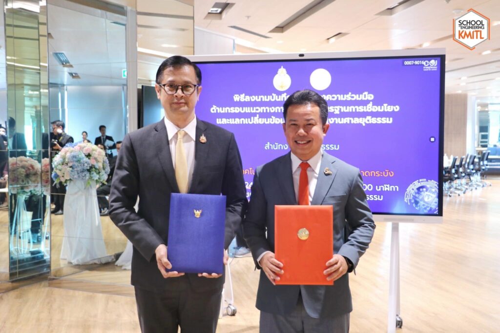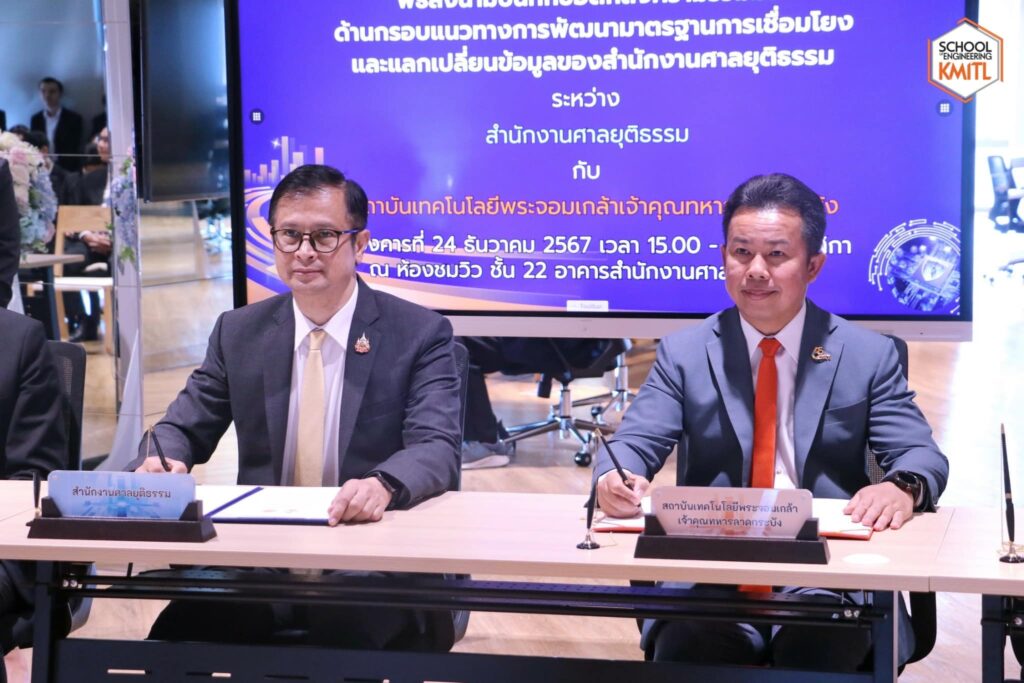เมื่อวันอังคารที่ 24 ธันวาคม 2567 ณ ห้องชมวิว ชั้น 22 อาคารสำนักงานศาลยุติธรรม ถนนรัชดาภิเษก รองศาตราจารย์ ดร.คมสัน มาลีสี อธิการบดีสถาบันเทคโนโลยีพระจอมเกล้าเจ้าคุณทหารลาดกระบัง (สจล.) พร้อมด้วยนายธีรทัย เจริญวงศ์ เลขาธิการสำนักงานศาลยุติธรรม ร่วมลงนามบันทึกข้อตกลงความร่วมมือด้านกรอบแนวทางการพัฒนามาตรฐานการเชื่อมโยงและแลกเปลี่ยนข้อมูลของสำนักงานศาลยุติธรรมระหว่างสำนักงานศาลยุติธรรมกับสถาบันเทคโนโลยีพระจอมเกล้าเจ้าคุณทหารลาดกระบัง