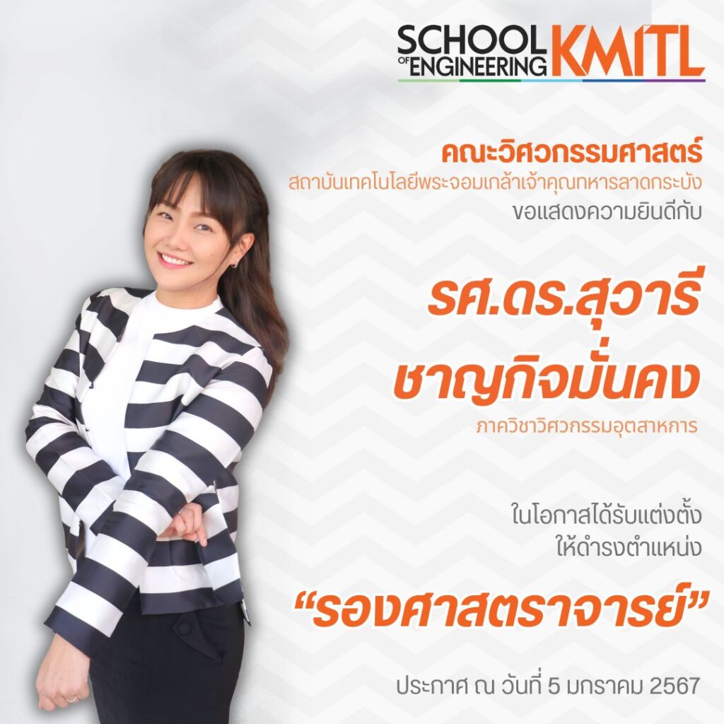 คณะวิศวกรรมศาสตร์ สถาบันเทคโนโลยีพระจอมเกล้าเจ้าคุณทหารลาดกระบังขอแสดงความยินดีกับรศ.ดร.สุวารี ชาญกิจมั่นคงภาควิชาวิศวกรรมอุตสาหการในโอกาสได้รับแต่งตั้งให้ดำรงตำแหน่ง“รองศาสตราจารย์”ประกาศ ณ วันที่ 5 มกราคม 2567