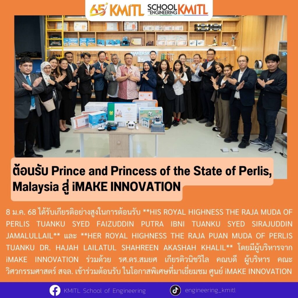 เมื่อวันที่ 8 มกราคม 2568 ได้รับเกียรติอย่างสูงในการต้อนรับ **HIS ROYAL HIGHNESS THE RAJA MUDA OF PERLIS TUANKU SYED FAIZUDDIN PUTRA IBNI TUANKU SYED SIRAJUDDIN JAMALULLAIL** และ **HER ROYAL HIGHNESS THE RAJA PUAN MUDA OF PERLIS TUANKU DR. HAJAH LAILATUL SHAHREEN AKASHAH KHALIL** โดยมีผู้บริหารจาก iMAKE INNOVATION ร่วมด้วย รศ.ดร.สมยศ เกียรติวนิชวิไล คณบดี ผู้บริหาร คณะวิศวกรรมศาสตร์ สจล. เข้าร่วมต้อนรับ ในโอกาสพิเศษที่มาเยี่ยมชม ศูนย์ iMAKE INNOVATION