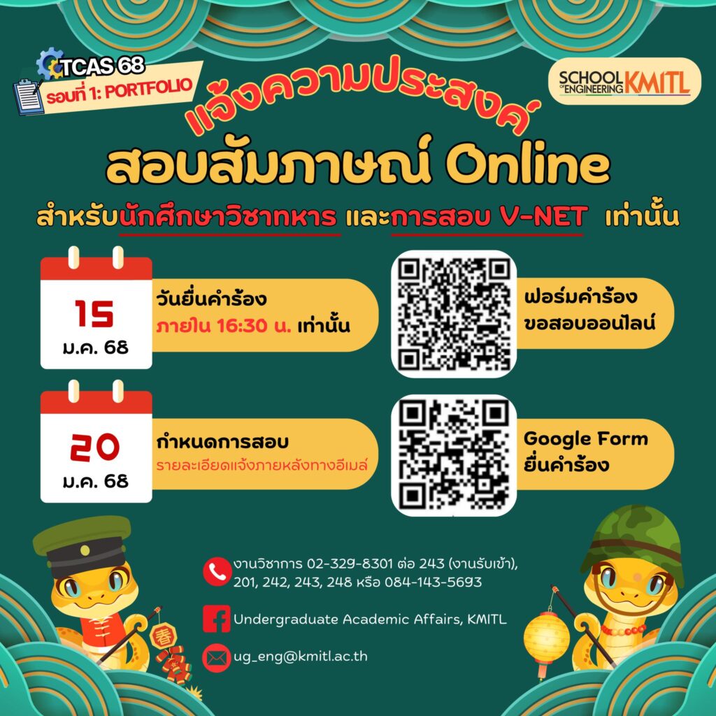 ทั้งนี้ รูปแบบการสัมภาษณ์ไม่มีผลต่อการพิจารณาผู้มีสิทธิ์เข้าศึกษา และการตัดสินผลการสอบสัมภาษณ์ถือเป็นสิทธิ์เด็ดขาดของกรรมการสอบสัมภาษณ์ และคณะวิศวกรรมศาสตร์ สจล.
