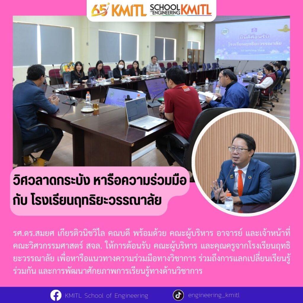 รศ.ดร.สมยศ เกียรติวนิชวิไล คณบดี พร้อมด้วย คณะผู้บริหาร อาจารย์ และเจ้าหน้าที่ คณะวิศวกรรมศาสตร์ สจล. ให้การต้อนรับ คณะผู้บริหาร และคุณครูจากโรงเรียนฤทธิยะวรรณาลัย เพื่อหารือแนวทางความร่วมมือทางวิชาการ ร่วมถึงการแลกเปลี่ยนเรียนรู้ร่วมกัน และการพัฒนาศักยภาพการเรียนรู้ทางด้านวิชาการ