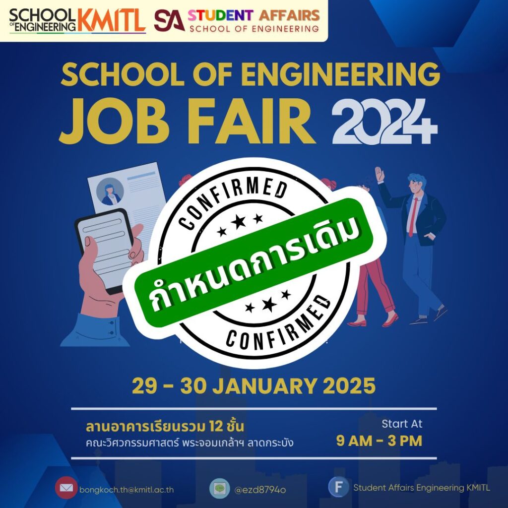 งานกิจการนักศึกษา คณะวิศวกรรมศาสตร์ กำหนดจัดงาน School of Engineering JOBFAIR 2024 ตามกำหนดการเดิม ในระหว่างวันที่ 29 – 30 มกราคม 2568 ณ อาคารเรียนรวม 12 ชั้น