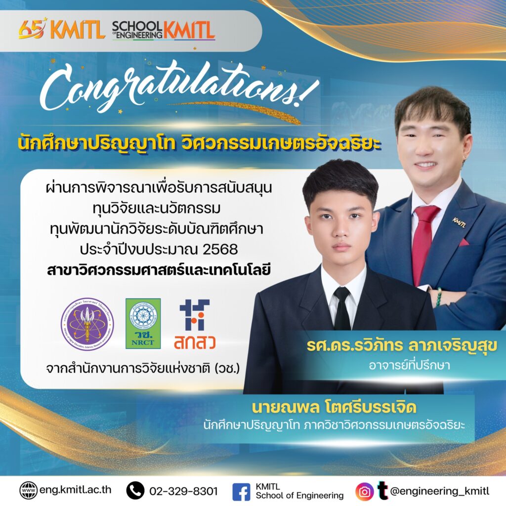 ขอแสดงความยินดีอย่างยิ่งกับ “นายณพล โตศรีบรรเจิด” นักศึกษาระดับปริญญาโท ภาควิชาวิศวกรรมเกษตร ในโอกาสได้ผ่านการพิจารณาเพื่อรับการสนับสนุนทุนวิจัยและนวัตกรรม ทุนพัฒนานักวิจัยระดับบัณฑิตศึกษา ประจำปีงบประมาณ 2568 จากสำนักงานการวิจัยแห่งชาติ