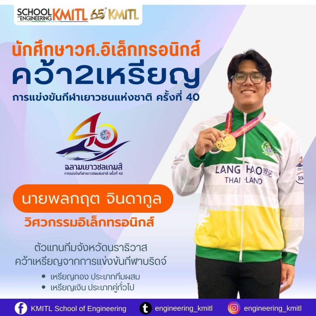 คณะวิศวกรรมศาสตร์ สจล. ขอแสดงความยินดีกับ นายพลกฤต จินดากูล นักศึกษาชั้นปีที่ 2 ภาควิชาวิศวกรรมอิเล็คทรอนิกส์ สจล. และเป็นตัวแทนทีมจังหวัดนราธิวาส คว้าเหรียญในการแข่งขันกีฬาบริดจ์ จากการแข่งขั้นกีฬาเยาวชนแห่งชาติ ครั้งที่ 40 “ฉลามเยาวชลเกมส์”