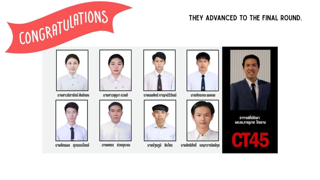 ได้รับคัดเลือกเป็นตัวแทนของคณะวิศวกรรมศาสตร์ สจล. เพื่อเข้าแข่งขันในรอบชิงชนะเลิศในลำดับต่อไป