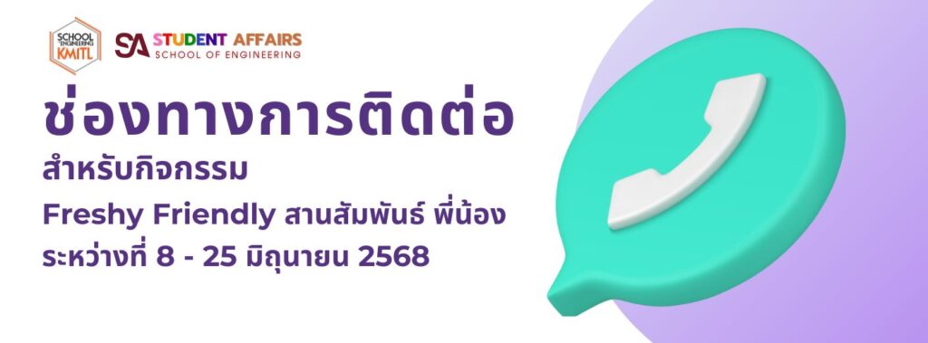สำหรับกิจกรรม “Freshy Friendly สานสัมพันธ์ พี่น้อง” ระหว่างที่ 8 – 25 มิถุนายน 2568 น้องๆนักศึกษาใหม่ สามารถติดต่อสอบถามไปยังภาควิชาที่น้องๆสังกัดได้ดังนี้