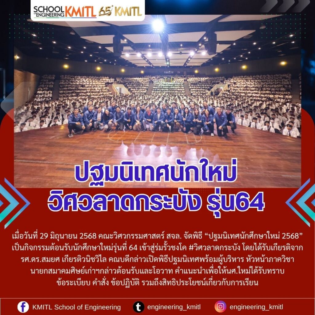คณะวิศวกรรมศาสตร์ สจล. จัดพิธี “ปฐมนิเทศนักศึกษาใหม่ 2568” เป็นกิจกรรมต้อนรับนักศึกษาใหม่รุ่นที่ 64 เข้าสู่ร่มรั้วชงโค