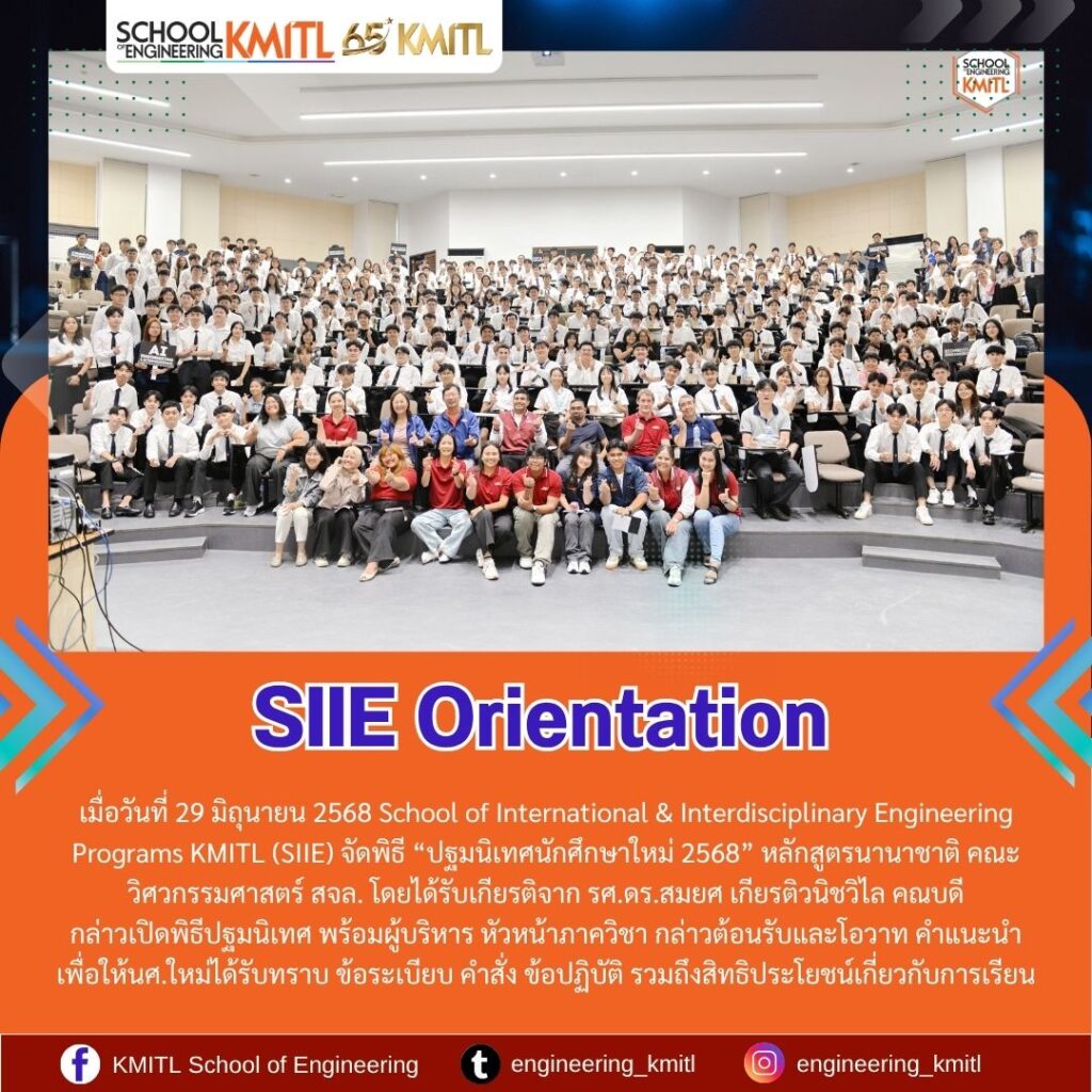 เมื่อวันที่ 29 มิถุนายน 2568 School of International & Interdisciplinary Engineering Programs KMITL (SIIE) จัดพิธี “ปฐมนิเทศนักศึกษาใหม่ 2568” หลักสูตรนานาชาติ คณะวิศวกรรมศาสตร์ สจล. โดยได้รับเกียรติจาก รศ.ดร.สมยศ เกียรติวนิชวิไล คณบดีกล่าวเปิดพิธีปฐมนิเทศ พร้อมผู้บริหาร หัวหน้าภาควิชา กล่าวต้อนรับและโอวาท คำแนะนำ เพื่อให้นศ.ใหม่ได้รับทราบ ข้อระเบียบ คำสั่ง ข้อปฏิบัติ รวมถึงสิทธิประโยชน์เกี่ยวกับการเรียน