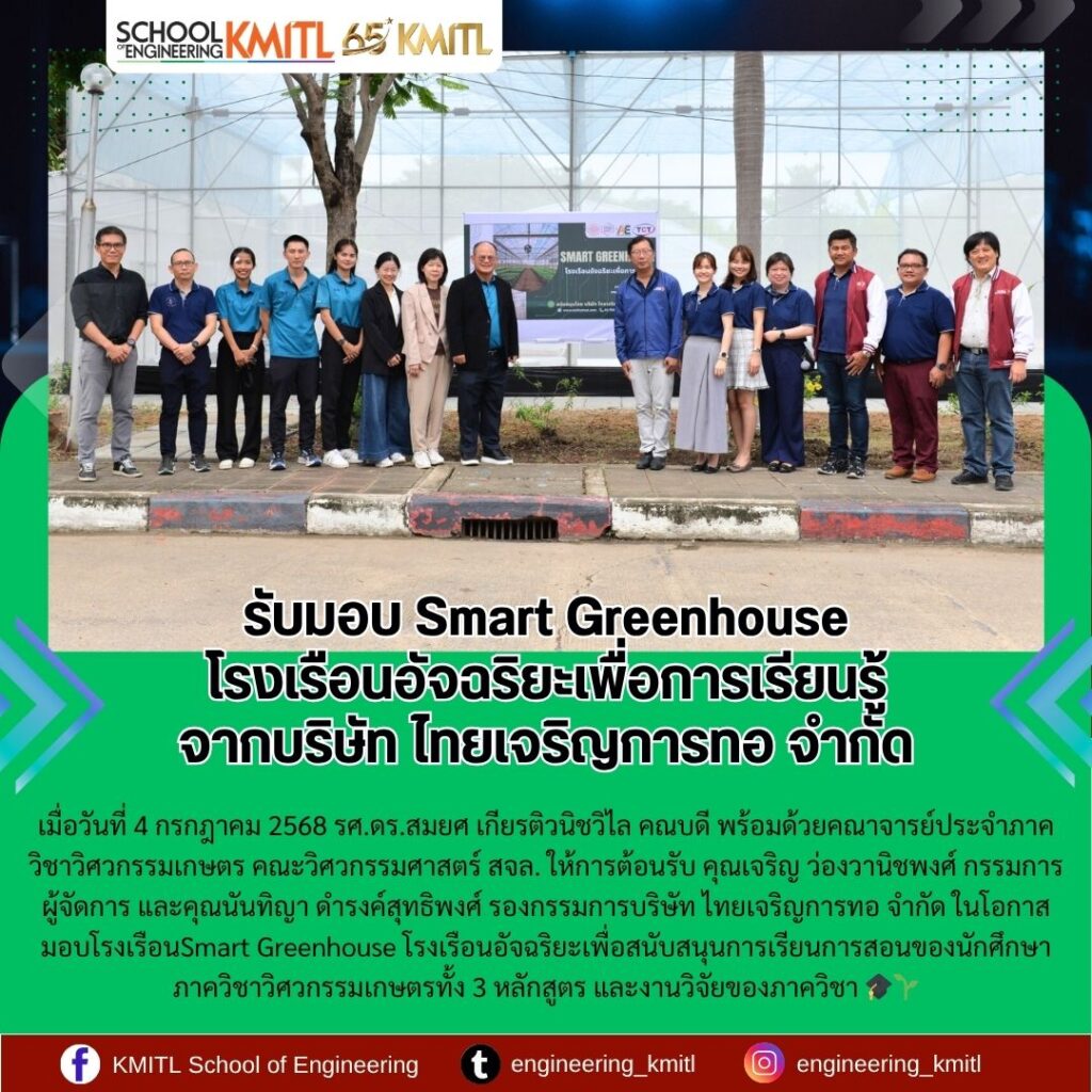 เมื่อวันที่ 4 กรกฎาคม 2568 รศ.ดร.สมยศ เกียรติวนิชวิไล คณบดี พร้อมด้วยคณาจารย์ประจำภาควิชาวิศวกรรมเกษตร คณะวิศวกรรมศาสตร์ สจล. ให้การต้อนรับ คุณเจริญ ว่องวานิชพงศ์ กรรมการผู้จัดการ และคุณนันทิญา ดำรงค์สุทธิพงศ์ รองกรรมการบริษัท ไทยเจริญการทอ จำกัด ในโอกาสมอบโรงเรือนSmart Greenhouse โรงเรือนอัจฉริยะเพื่อสนับสนุนการเรียนการสอนของนักศึกษาภาควิชาวิศวกรรมเกษตรทั้ง 3 หลักสูตร และงานวิจัยของภาควิชา