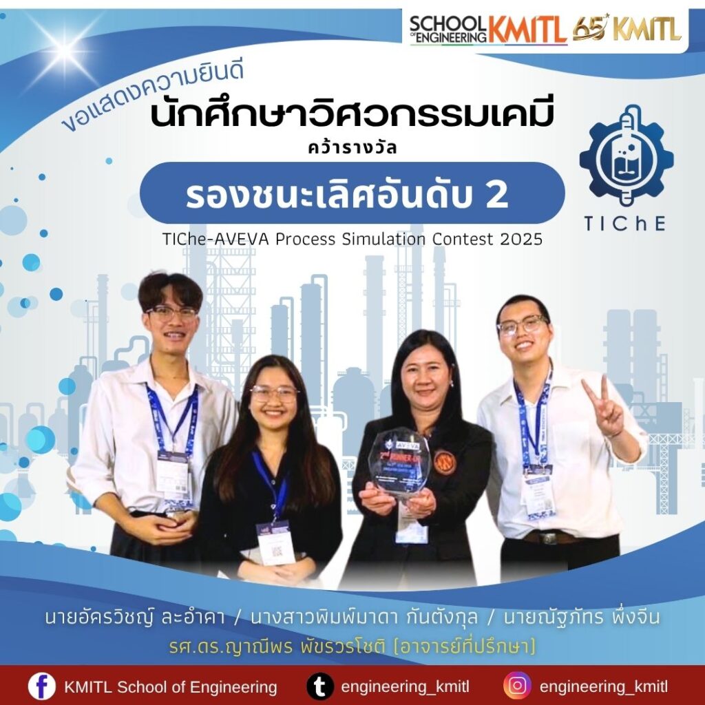 คณะวิศวกรรมศาสตร์ สจล.ขอแสดงความยินดีกับนักศึกาาภาควิชาวิศวกรรมเคมี ในโอกาสคว้ารางวัลรองชนะเลิศอันดับ 2 จากการแข่งขัน 2nd TICHE AVEVA PROCESS SIMULATION CONTEST 2025 ในการประชุมวิชาการ the 34th Thai Institution of Chemical Engineering and Applied Chemistry International Conference (TIChE2025) ณ โรงแรมดุสิตธานี พัทยา