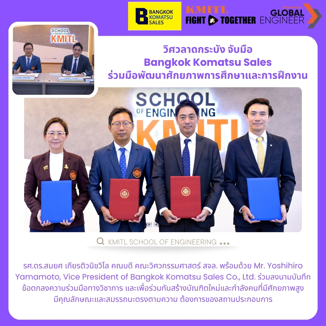 เมื่อวันที่ 26 มีนาคม 2567 รศ.ดร.สมยศ เกียรติวนิชวิไล คณบดี คณะวิศวกรรมศาสตร์ สจล. พร้อมด้วย Mr. Yoshihiro Yamamoto, Vice President of Bangkok Komatsu Sales Co., Ltd. ร่วมลงนามบันทึกข้อตกลงความร่วมมือทางวิชาการ และเพื่อร่วมกันสร้างบัณฑิตใหม่และกำลังคนที่มีศักยภาพสูง มีคุณลักษณะและสมรรถนะตรงตามความ ต้องการของสถานประกอบการ